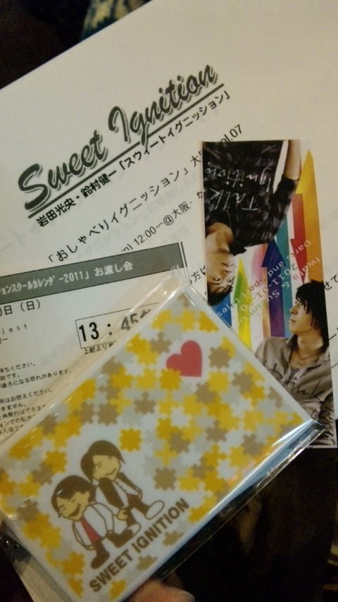 おしゃべりイグニッション行ってきた! ←おしゃべり前 おしゃべり後→ みたいな写メになってますが(笑) 今回1人参加だったのでゆっくり行ったらゆっくり行きすぎだったみたいで 整理番号意味ありませんでした(^_^;) あとお渡しあることも知らなくて(←)グッズ買う予定なかったから カバンも小さいので行っちゃってたり 入ったの自体遅いから物販も凄い並んだし 色々油断しちゃってました反省(>_<。) おしゃべり自体は途中にまさかの休憩コーナーがあるgdgdっぷりwww しかも休憩って言ってもステージ上では本人たち打ち合わせてるからね!? それを目の前にしながら気にせずトイレやらドリンクやらに行くお客さんてwww 自由過ぎるし素敵過ぎるわwww 時間がちょっとあいたらお2人もふっつーにお客さんと世間話的なのしてるしね(笑) あと10周年に何かおっきいことやるみたいですよー おおおおおお何が来るんだろどうしよおおおおおおお…! お渡しは何せ急だったので(←自業自得) 何喋るかぜんっぜん思いつかなくて妙に緊張しました…← とりあえずおしゃべり本編で話が出てたカナタとクロニクルツアーに行きますとだけ言っといた(笑) 何か…ちゃんと目、合ったなあ…(←何) カレンダーは去年より好みな写真多くて良いよ今年!(笑) きっと去年と同様カレンダーとして使われることなく終わるだろうけど…(←←←)