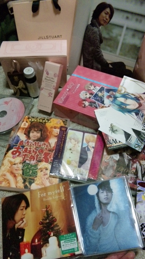 今日はお友達さんちにお邪魔して鑑賞会してきましたー! 見たDVDはルシアンイベントDVD、みゆくんvividDVD、ぐらんさん武道館DVD、神谷さんPV…だったかな(笑) どれも楽しかったあ…!! ルシアンは当日のことが思い出されたしぐらんさんはBRで見たんですけど綺麗過ぎる…!! 写メはお邪魔する前に青い店行って引き取ってきたりげとしたりしたものたち(笑) 中には借り物やプレゼントでいただいたものもあるんですが…!(>_<)