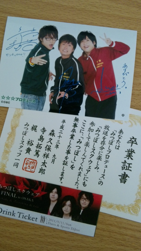 行ってきました三ツ星最終回! 最初はチケット取れなくて行けないと思ってたんですが 有り難いことに譲っていただけまして*・゜゚・*:.。..。.:*・'(*゚▽゚*)'・*:.。. .。.:*・゜゚・* スタンプに応じてブロマイドがもらえるんですが 青乃は全部には参加できてないので1枚のみでした(^_^;) にしてもすっっっっっごい人だった…!((((;゚Д゚))))))) 梶くん?てらしー?人気な、のか…!?